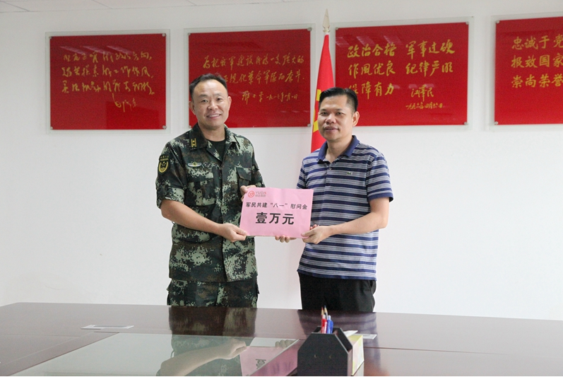 在“八一”建军节来临之际,为增进与部队官兵的情感交流,共话军民鱼水情谊,7月30日,由集团副总裁梁锋、总裁助理杨贻敏、杨硕、行政副总监罗桂平、行政部经理覃婷婷等一行领导组成慰问团,先后到武警来宾支队、广西陆军预备役兵师第一团、来宾市消防支队、中国人民解放军广西来宾军分区开展八一慰问活动,向部队官兵表达了崇高的敬意并送去节日祝福。