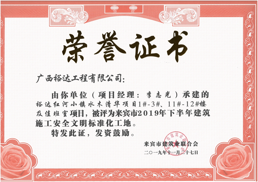 裕达红河小镇水木清华项目1#-3#、11#-12#楼及值班室项目被评为来宾市2019年下半年建筑施工安全文明标准化工地(项目经理:李志光)